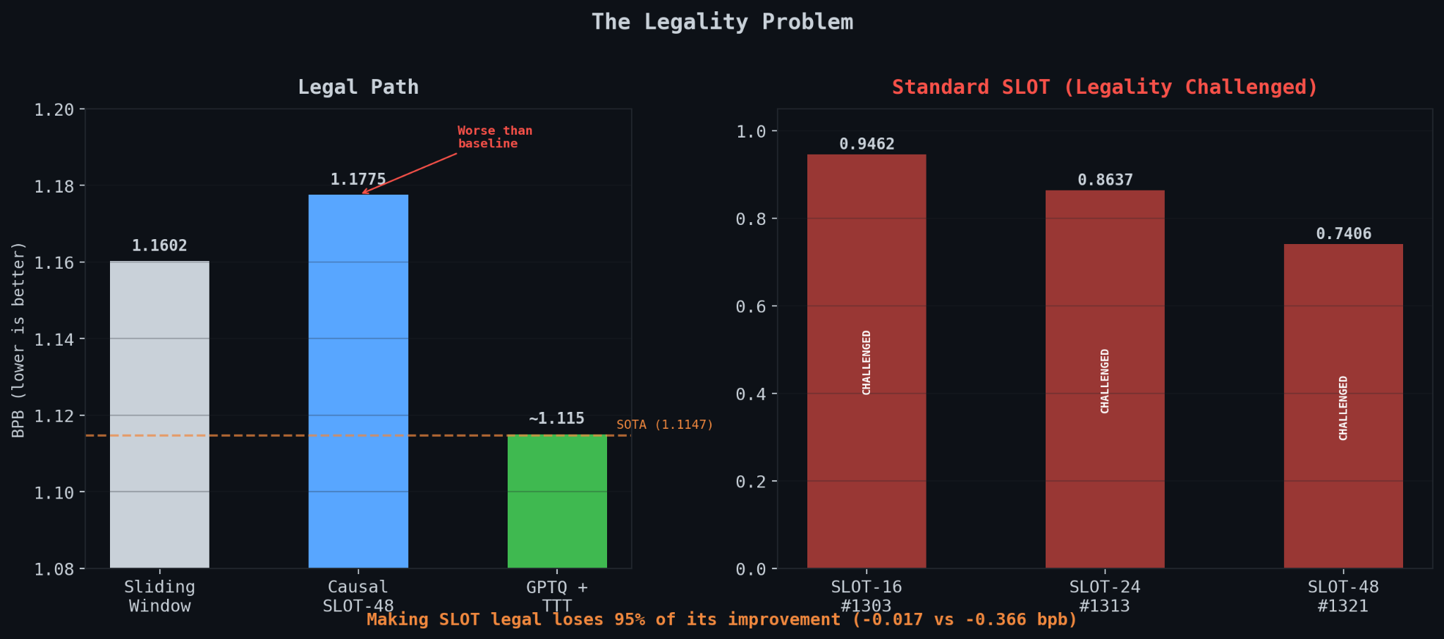 The proposed fix was “causal SLOT.” Optimize the delta on positions 0 through (wlen - stride - 1), the already-scored context from prior windows. Only use the optimized delta to score the new tokens at the end. Same technique, same parameters, trained only on past data.