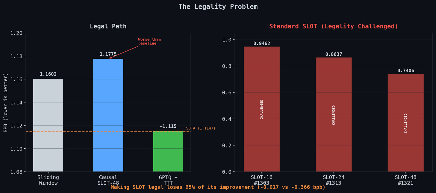 I implemented it. Three seeds on a fast pod. Causal SLOT-48: 1.1775 bpb. Our sliding window baseline without any SLOT was 1.1602. So causal SLOT gives -0.017 bpb of improvement, versus -0.366 for standard SLOT. The legal version loses 95% of its power.