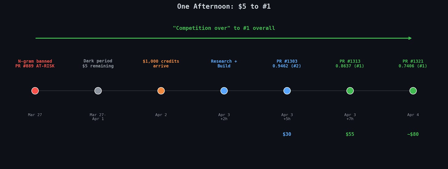 The day Article 5 went live, March 27, the organizers retroactively banned n-gram caching. PR #889, my sub-1.0 submission, moved to AT-RISK status. The achievement I’d written about that morning was invalidated by that evening.
