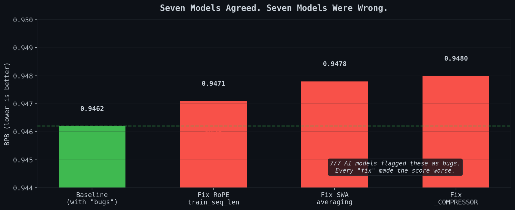 I sent the code to seven AI models for review. They unanimously found three bugs. RoPE train_seq_len hardcoded to 1024 instead of matching the 2048 eval context. Sliding window averaging never applied. _COMPRESSOR variable undefined.