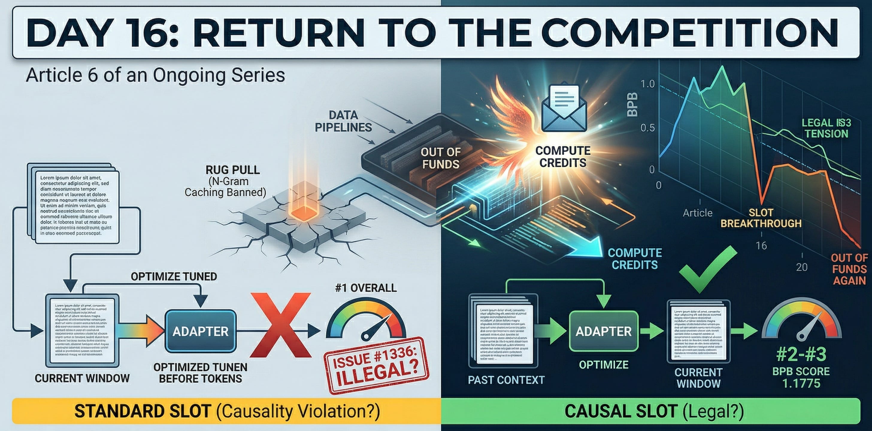 In Article 5, I hit sub-1.0 for the first time with an entropy-adaptive n-gram cache (0.9642 bpb), submitted six PRs including two diffusion models and a fused softcap+CE kernel, tested my own CoDA-GQA attention mechanism in competition conditions, and ran out of money. Five dollars left on the RunPod account. Competition over.