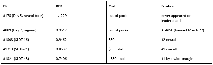 I applied for compute credits. Twice. Never heard back. The competition frontier kept moving without me. Other competitors reached 0.93 bpb using new techniques my research had unearthed but without guidance or money I was reluctant: SLOT, QK-Gain sweeps, Scylla tokenizer. I watched from the sideline with $5 on my account and a growing suspicion that this competition wasn’t designed for a 46-year-old independent consultant funding his own GPU time.