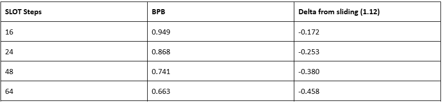 With a fast pod secured, I ran a 6-configuration hyperparameter sweep on SLOT. The variables: SLOT steps (how many optimization steps per window), learning rate, and evaluation stride.