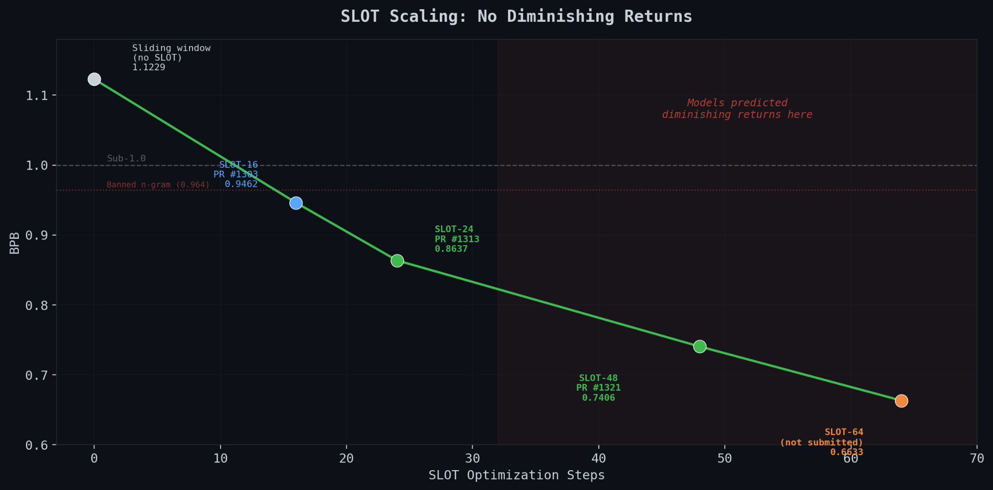 No diminishing returns through 64 steps. SLOT keeps finding structure in the hidden-state-to-logit mapping that takes many optimization steps to exploit. The models were wrong about the scaling. Again.