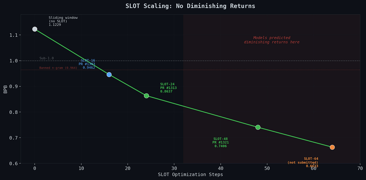 From 1.1229 to 0.9462 with SLOT. That’s 0.177 bpb of improvement from eval-time optimization alone. The model architecture is identical to what I submitted on Day 5. Same weights. Same training. The only difference is what happens after training.